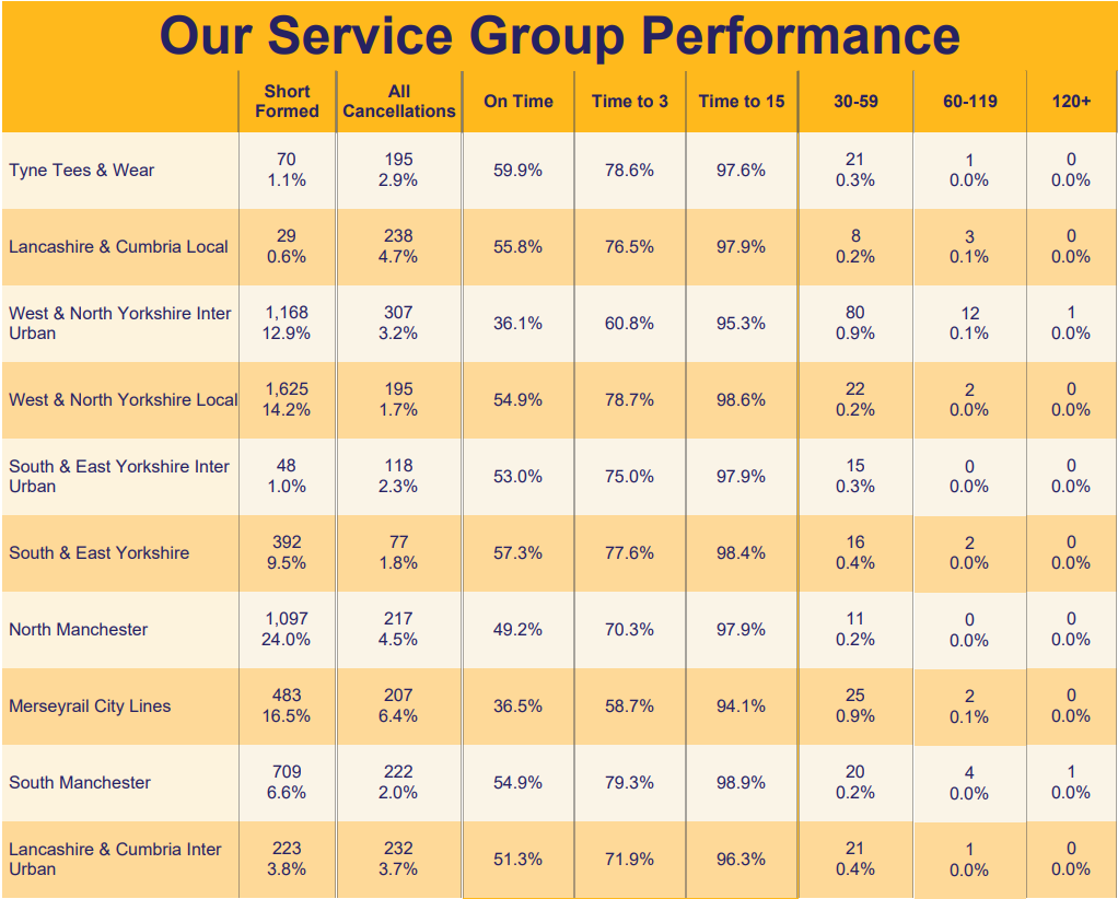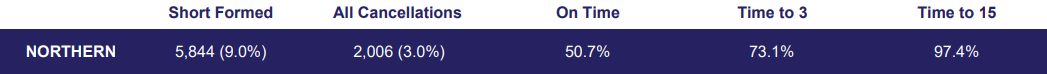 Services in the timetableServices removed from the plan by Northern (Mon – Sat)Services removed from the plan by Northern (Sunday only)Services removed from the plan by Northern (Total)Services plannedServices operated on the day