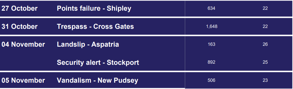 The above incidents had a combined impact of 118 cancellations and 3,843 minutes delay which resulted in disruption to 495 Northern services.