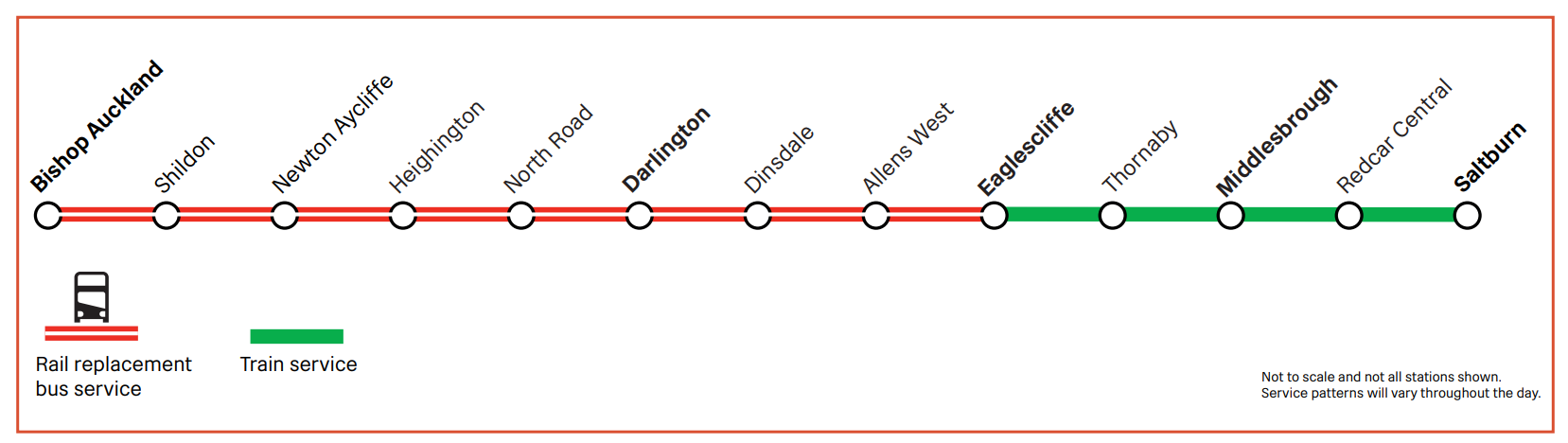 | 14 - 15 March | North East | Between Bishop Auckland and Saltburn | Buses run between Darlington and Saltburn |
