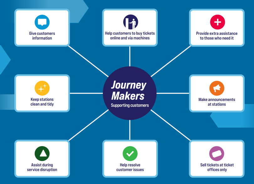Journey Makers will be based at stations, although no longer within ticket offices. They’ll be available in other areas of the station to help customers face to face with a wide range of needs. This includes supporting people who need extra help travelling through stations and onto our trains.