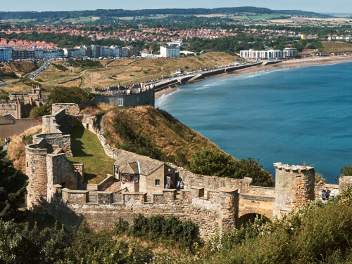 Perched on top of a cliff overlooking the North Sea, Scarborough Castle in North Yorkshire offers breathtaking views and a glimpse into England's maritime history. With Scarborough train station nearby, visitors can easily access this iconic landmark. Explore the castle's dramatic ruins before venturing out to enjoy Scarborough's sandy beaches, seaside promenade, and traditional fish and chips - an iconic England seaside town!