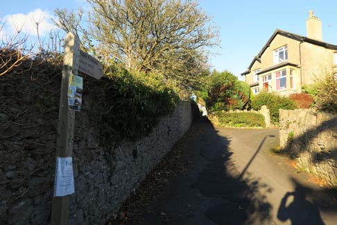 From Arnside train station, cross over Station Road and turn left, to have the railway on your left side. Just past the garage, the footpath rises from the road, and when it drops down, take the footpath on the right before the houses. The path turns sharp left and skirts between woods on either side. Eventually, the path comes out at a junction on Silverdale Road.