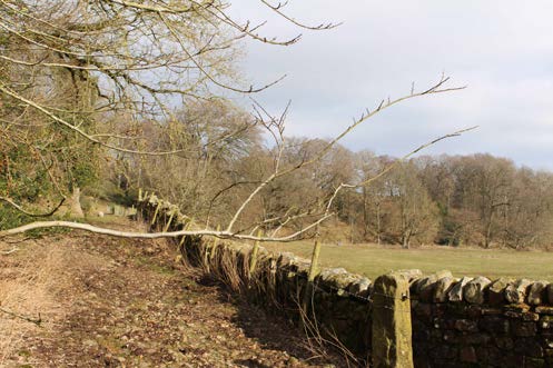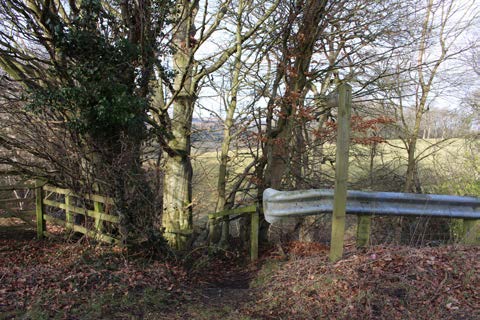 Crossing the A69 can be tricky, so be careful. Climb the stile at the far side of the road and head towards the left of the trees in the middle of the field. Walk towards the big row of trees straight ahead. Once through the trees, look for a gap in the boundary and walk down to the path below, turning right onto the path.