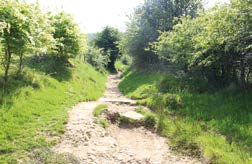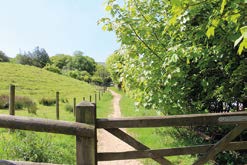 At the fork in the paths, take the right-hand track, taking care around the rocks and uneven ground. The path eventually reaches a small gate in a stone wall – go through the gate and across the field, following the obvious path.