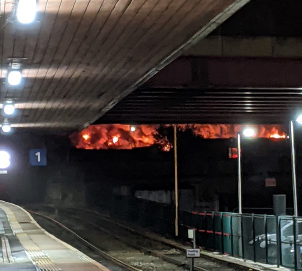 The fire, which was first reported in the early hours of this morning (Monday) continues to cause significant disruption to journeys between West Yorkshire and Greater Manchester.