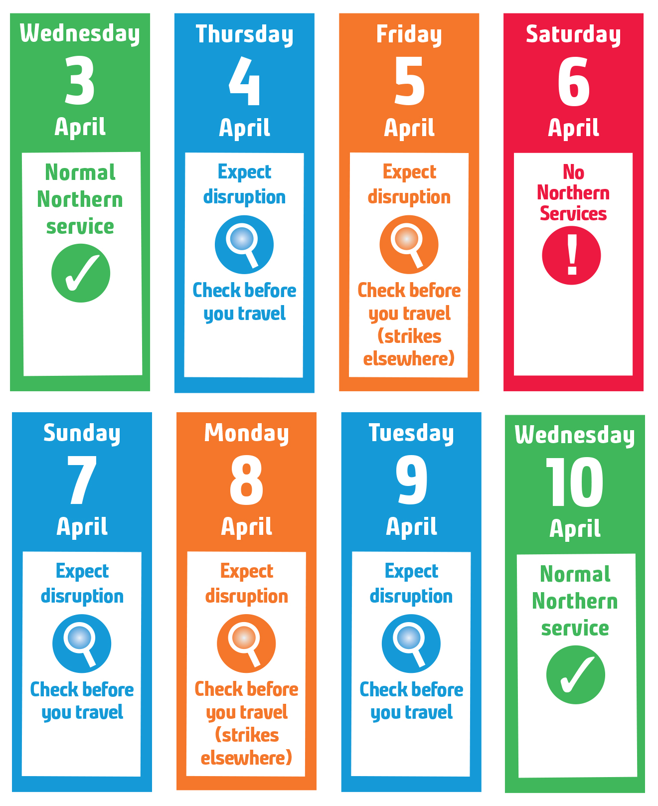 Whilst Northern services are affected on Saturday 6 April, other train operators face walk-outs by ASLEF members on Friday 5 April and Monday 8 April. As such, Northern customers making journeys that include connecting services on those days should check all legs of their journey.