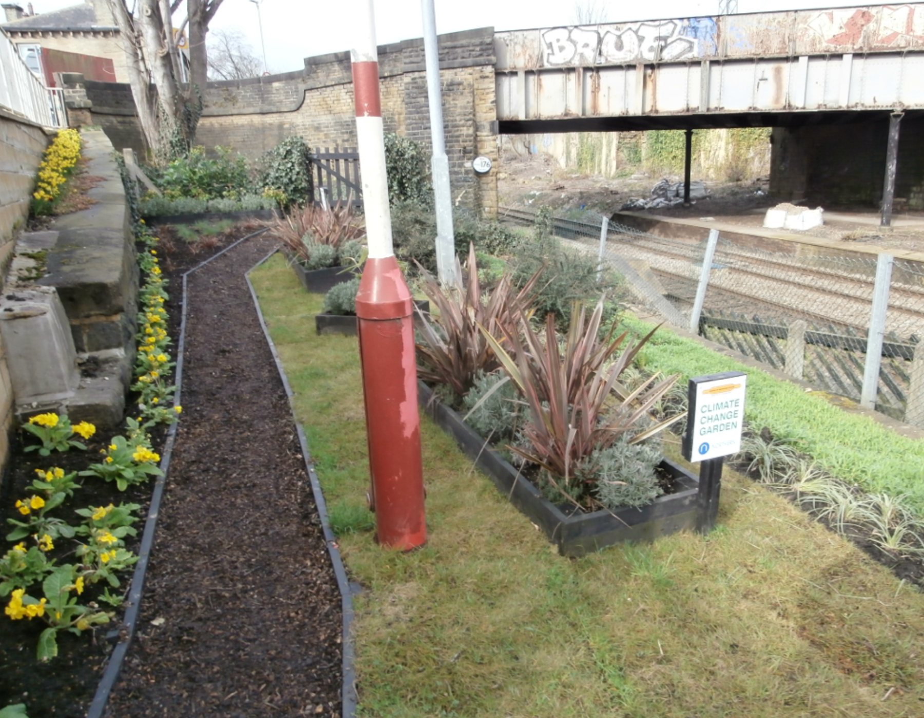 The old goods yard and railway siding have been transformed by a 15-person team from the Friends of Brighouse Station, who helped clear the overgrown trees and litter before weeding the area and constructing raised beds filled with drought-resistant plants and a woodchipped path, using recycled timber from an old fence at Platform 1.